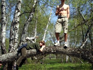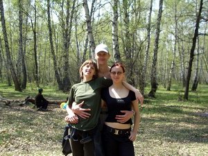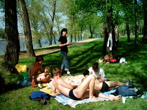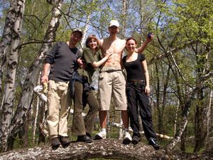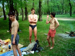 Покупаю сметану. Еду в Энгельс. Обнаруживаю нашу компанию недалеко от воды, с костром и развесёлым Басаем, лежащим на столе с бутылкой водки «Главспирт». Принимаю пляжный вид и приступаю к распитию последней. /Басай запивал водку вином )))/ Настроение в гору. Лес наводнёнм развесёлым подвыпившим народом, солнышко пригревает и вообще, всё супер!