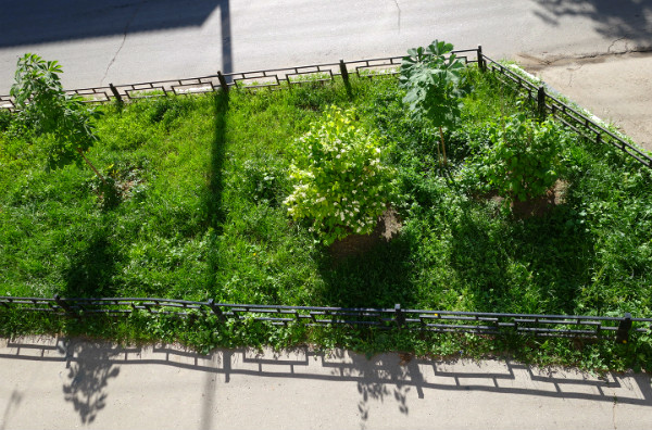 Еще моя мама лет 30 тому назад пыталась высаживать здесь какую-то растительность, усердно таская ведрами воду через весь двор. Естесственно, горячим солнечным летом всё высыхало и вытаптывалось и идея была признана нереализуемой и заброшена.