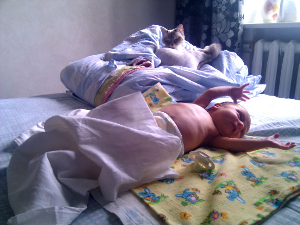 С появлением Санька очень сильно изменился кот. Помимо внешних изменений, обусловлынных хозяйской стрижкой, кот ревностно оберегает мелкого, когда тот кричит, кот тоже начинает нервничать, лезет, орет, волнуется... Решили, что можно допустить его в спальню, т.к. из-за жары двери все равно не закрываем.