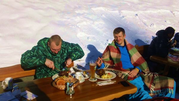 Приморозило, снега со вчерашнего утра не было и трассы зачастую стали довольно жесткими. Прибавить к этому огромное количество народа и перемещение становилось довольно затруднительным... По пути нам встречались приятные ресторанчики, где народ приятно проводил время, загорая в шезлонгах на улице (на солнце было довольно тепло) и велик был соблазн к ним присоединиться, однако рулька влекла и ...