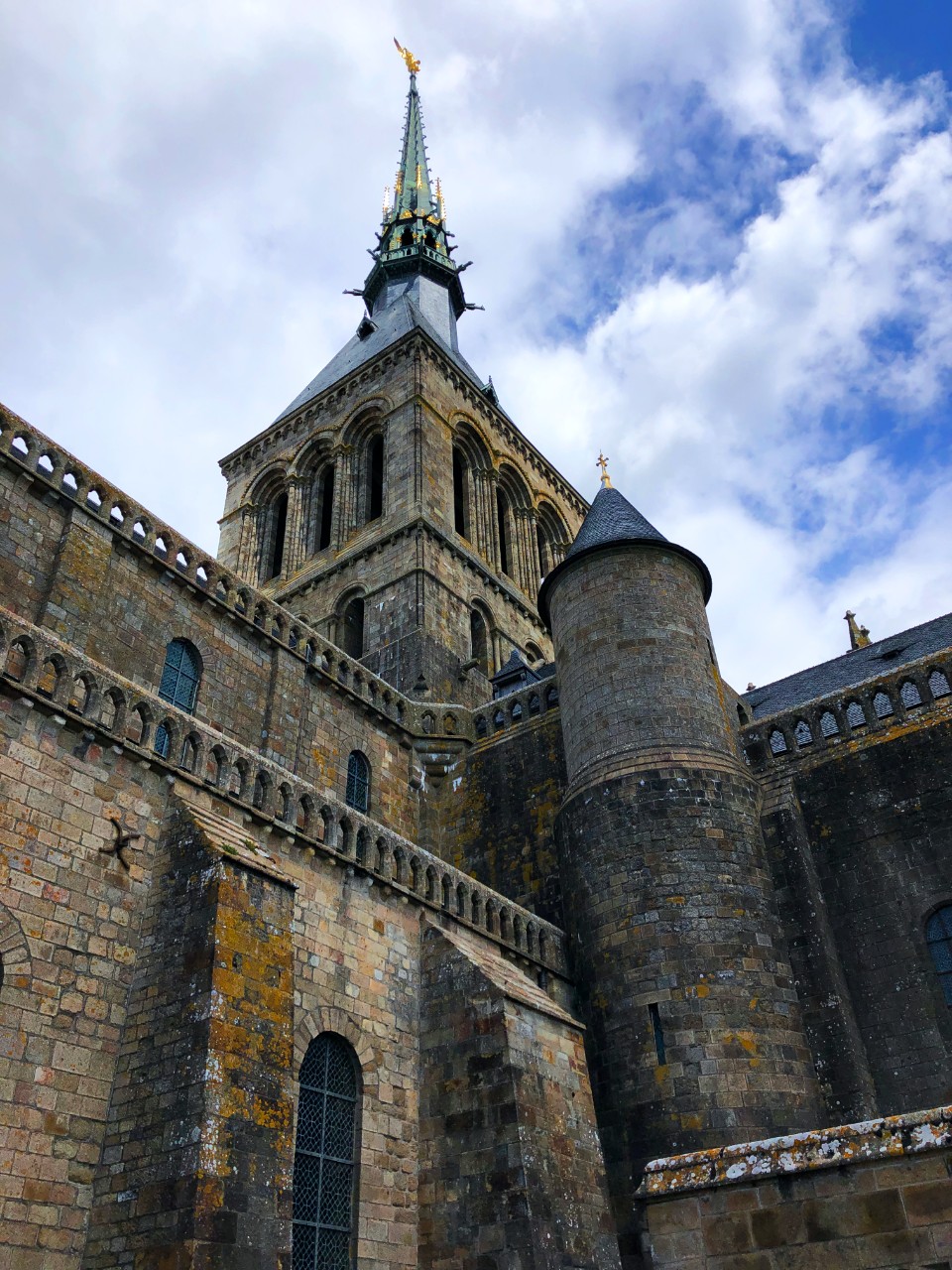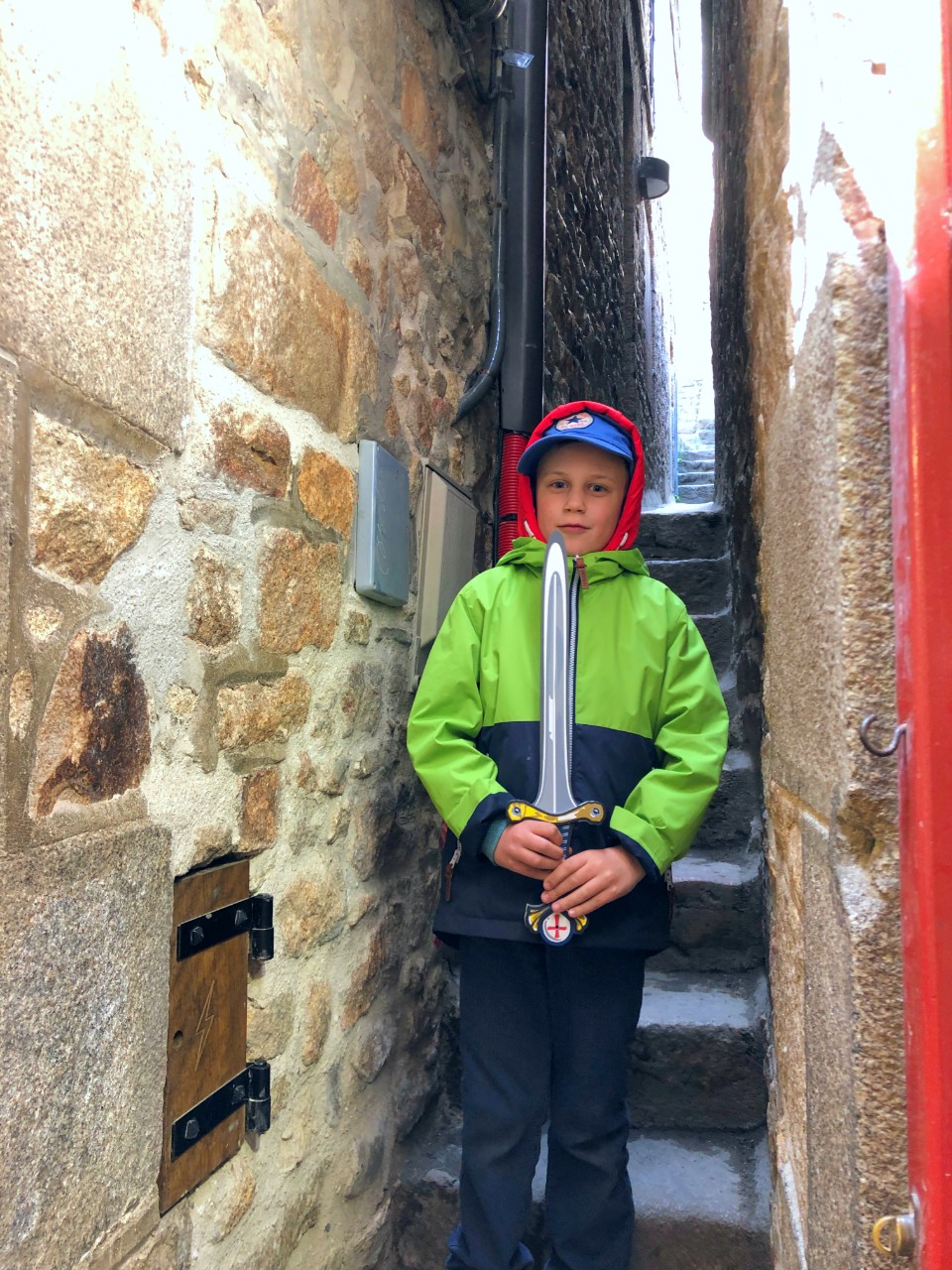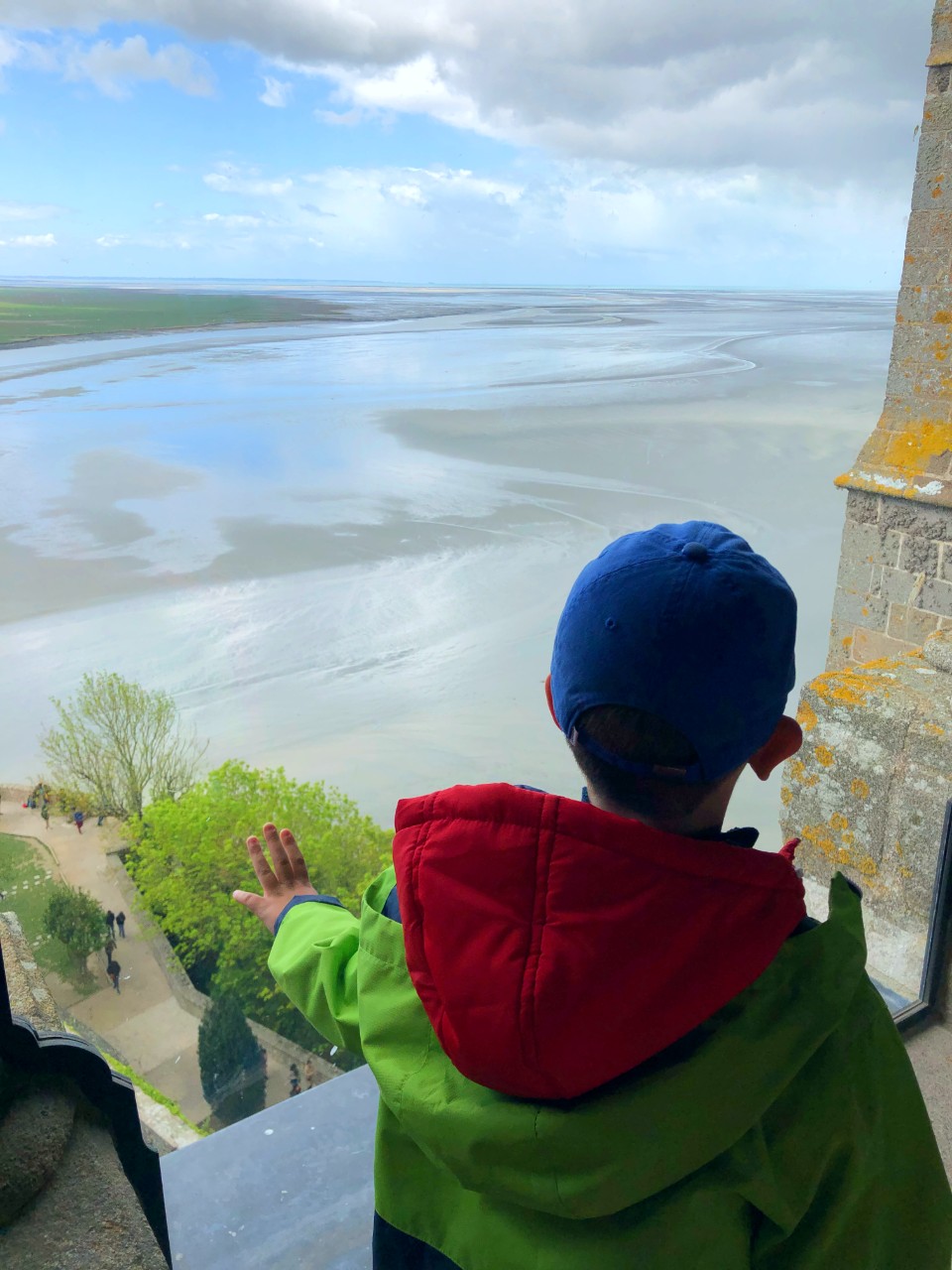 Посещение Мон-Сен-Мишеля с самого начала был мероприятием сомнительным, т.к. все улочки там очень узкие, брусчатые и с огромным количеством лестниц. Протискиваясь в толпе, мы как смогли высоко втащили на руках коляску с малышкой, и остановившись на небольшой смотровой площадке решили, что я поразвлекаю ее печеньками здесь, а Таня с Саньком совершат вылазку в по зданиям комплекса аббатства.
