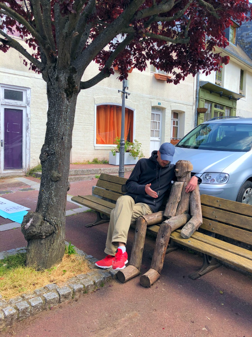 Хоть мы и прибыли сюда в понедельник, город был абсолютно пуст - вчера здесь закончился фестиваль сидра и кроме детей, резвящихся на школьном дворе, было очень тихо. Все магазины и кафе, соответственно, тоже были закрыты. Мы прошлись поглазеть по местным улочкам, сфотографировались с деревянным завсегдатаем, и случайно узрели красноречивый дорожный указатель Route du Cidre.