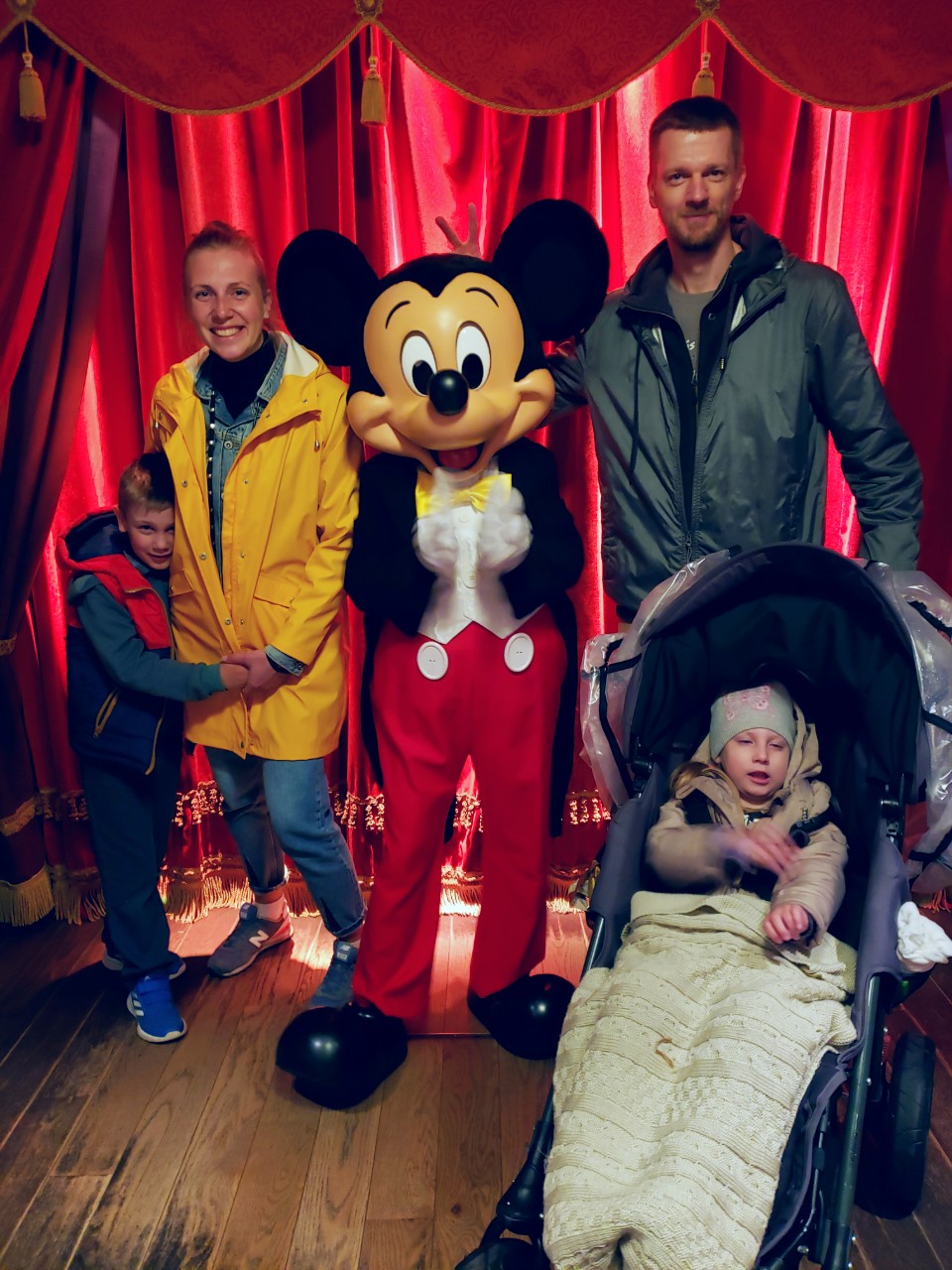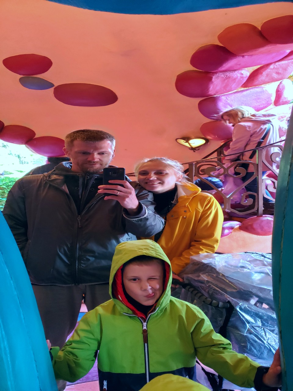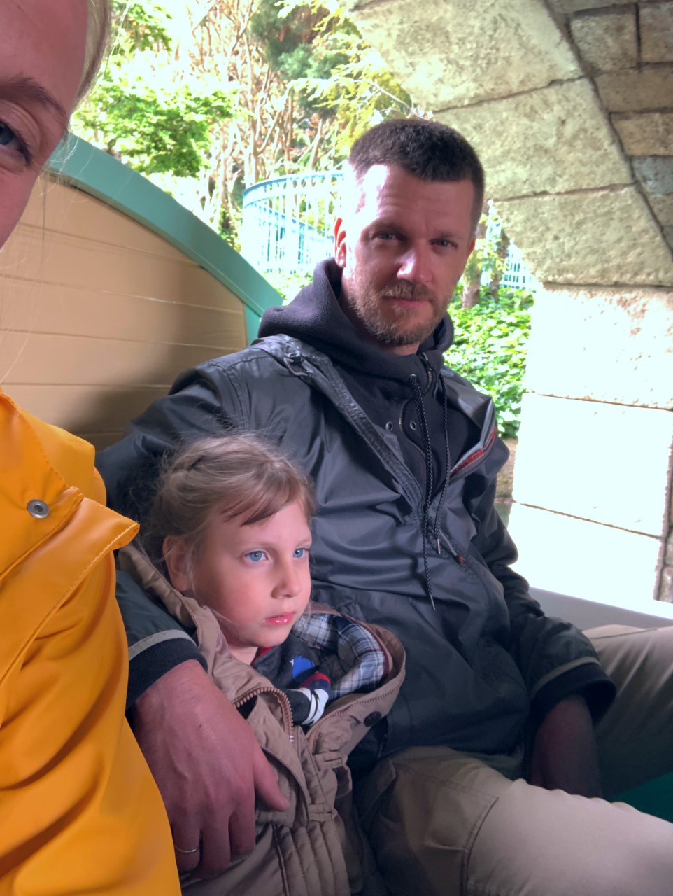 Утром шел дождь. Не ливень, конечно, но вполне себе мокрый и с холодным ветром. Мы еще с вечера решили "ну что ж теперь?", начитались отзывов о посещении парка в дождь и в целом, были готовы к худшему. Нарядившись в дождевики и укутав малышку, мы отправились.