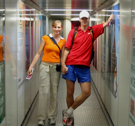 Следует отметить, что летать самолётами мне раньше не приходилось (за исключением того случая, когда мы с Настюхой прыгали с парашютами в Дубках) и поэтому то, что я увидел далее, было для меня (да и для Танюхи тоже) полной неизвестностью... Вход на вокзал через металлодетектор, толпы иностранцев с заклеенными полиэтиленом чемоданами, красный и зелёный коридоры, регистрация, сдача багажа, паспортный контроль, duty-free (кстати в Москве по ценам даже дороже, чем в обычных магазинах...((), посадка...