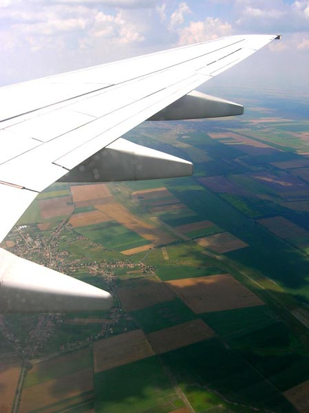 Летели самолётом венгерской авиакомпании MALEV боингом 737. С момента посадки в самолёт по-русски нам приходилось говорить только между собой, с попутчиками и гидом. Изредка встречались русскоговорящие официанты или выходцы из России. В остальное же время у нас была прекрасная возможность попрактиковаться в английском. Что касается венгерского языка, как говорится в путеводителе: "Если вы хотите понимать, что говорят венгры, нет ничего проще! Нужно просто выучить венгерский!". Сий язык абсолютно не созвучен ни с английским, ни с русским, посему, даже приблизительно понять, о чём венгры говорят практически невозможно. Однако, мы всё же смогли осилит местное "спасибо" (пишется "köszönöm", а произносится и того сложнее), чем неизменно приводили в восторг местное население, с которым нам приходилось общаться )) Итак, самолёт. Взлёт и посадку, проанонсированные нам как жуткие болезненные перегрузки, мы с Танюхой перенесли достаточно легко, а сам полёт прошёл приятно и практически незаметно, т.к. нас покормили и мы не упустили возможности оттянуться несколько раз по местному винцу))