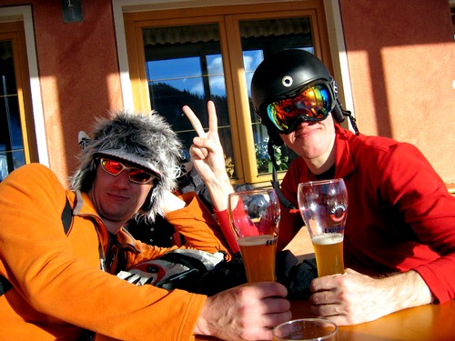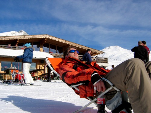 Ну и напоследок о том, что происходит после катания. Понятие это хорошо известно среди отдыхающих и на всех языках называется "Apre ski". На деле это выглядит так: не успев сойти с подъёмника народ заваливается в ближайший бар, оставив лыжи/борды прямо на улице, как есть, в куртках и горнолыжных ботинках и тусят до поздней ночи. Примерно вот так: