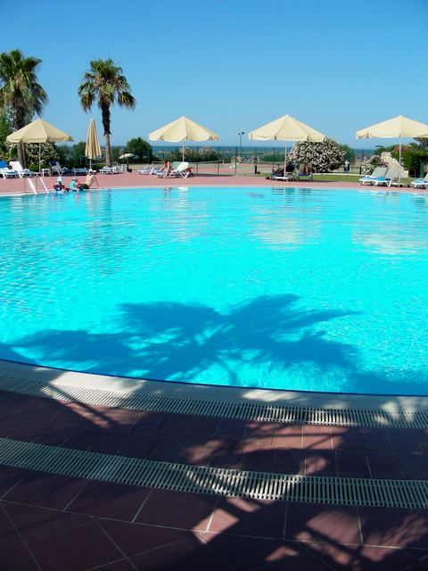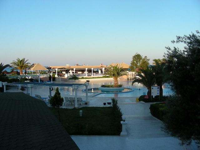 В 6 часов утра отдыхающие ещё спят, персонал потихоньку разбирает лежаки, стулья к завтраку, накрывает столы и готовится к началу ещё одного дня вакханалии. На территории отеля раннее утро - наверное самое приятное время. Ещё прохладно, у бассейнов никого нет, не орёт музыка и не шумят дети. При утреннем обходе нами были найдены (in order of appearance): "лобби бар", магазин, большой круглый бассейн с кадкой с пальмой посередине, лежаки, кабинка аниматоров, поле для мини-гольфа, малый бассейн, 3 теннисных корта (в приемлемом состоянии), баскетбольная площадка, пляж, площадка для пляжного волейбола, Средиземное море... Увиденным мы остались довольны.