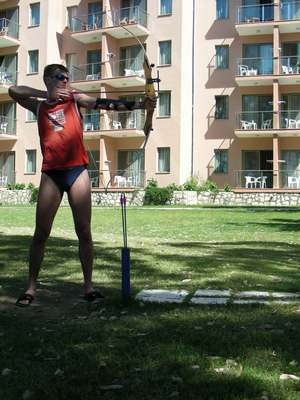 В 10 часов началась анимационная программа. Молодые ребята скакали между лежаков, привлекая "тюленящих" отдыхающих к активным развлечениям. На повестке были: утренняя зарядка, пляжный волейбол, "боча", стрельба из пневматической винтовки, дартс, игры на воде, водная гимнастика, стрельба из лука и "мини-клуб" для детей. Не вдаваясь в детали, нам понравилось. В команде аниматоров работали как ребята из России, так и турки с немцами. Единогласно мы пришли к выводу, что "не наши" аниматоры к делу подходят значительно более ответственно и доброжелательно. Могу подтвердить сие на примере пляжного волейбола и стрельбы из лука. Что касается последнего - так там парень вообще жёг. Со смеху валялись даже зрители, не говоря уже об участниках. "Наши" же в основном вели себя безразлично или, как в случае со стрельбой из пневматики, вообще не адекватно. Как бы там ни было, у меня не очень укладывается в голове, когда молодой парень, проводяший стрельбы просто бросает винтовку на землю или упирает дулом в газон, опираясь на неё...