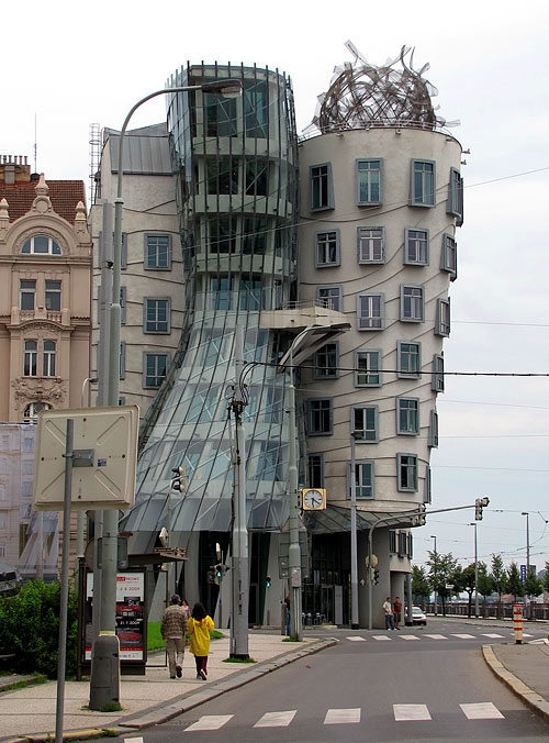 Когда-то давно, во время Второй Мировой, американские лётчики летели бомбить Дрезден, но "слегка" перепутали города и сбросили бомбы над ночной Прагой. Дом, стоявший здесь ранее, был полностью уничтожен и 50 лет после место пустовало. Потом был построен этот чудный танцующий дом, получивший название «Джинджер и Фред» в честь известной американской пары. Аборигены же называют его не иначе, как "стакан" :)