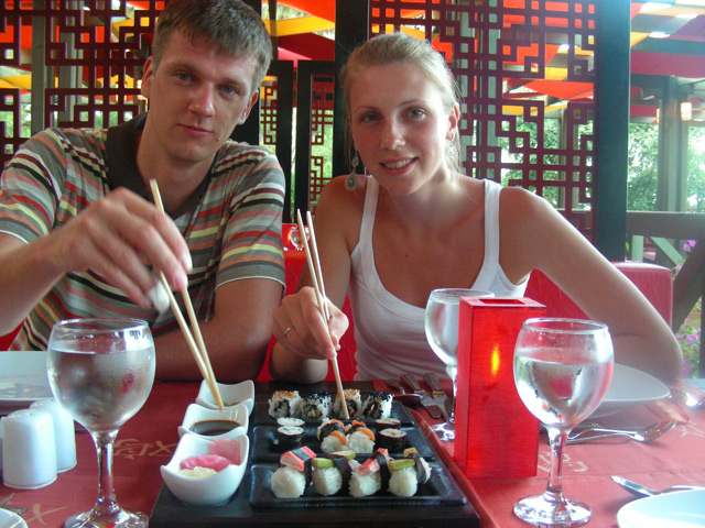 (большая порция креветок на шпажках 190 бат, суши/роллы по 10 бат за 1 шт. вне зависимости от вида)