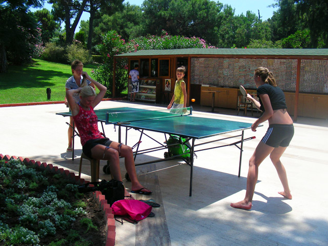 В составе нашей делегации присутствовали 2 КМС в этом виде спорта, поэтому я-таки захватил с собой чехол с парой ракеток. И не зря. Как оказалось, каждое утро аниматоры выкатывали на улицу пару столов, на которых даже с учётом ветра и ветхой сетки можно было вполне сносно играть. Таких "патриотов" отдыха с ракеткой в руках оказалось довольно много, так что мы участвовали в довольно ожесточённых баталиях :)