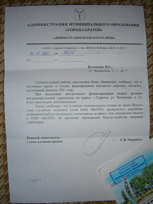 что ответили конечно хорошо, но вот только они этим ответом вежливо послали. потом они скажут, что финансирование недостаточное, а по поводу асфальтирования они уже сослались на ОАО "ВоТГК", типа это уже не наша проблема. а те сошлются на кого-то другого