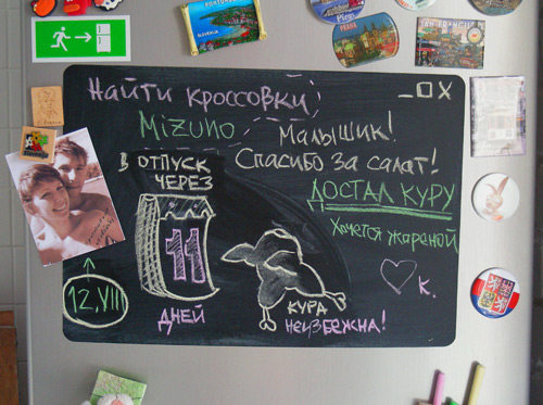 На новый холодильник успешно перекочевала лебедевская магнитная доска для рисования мелками. Стартовали обратный отсчет дней до отпуска...