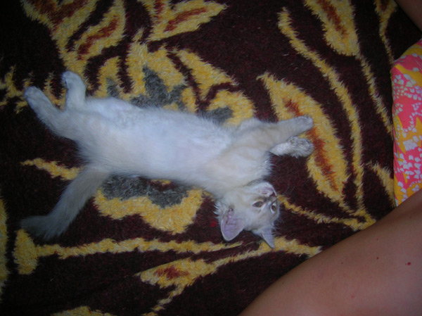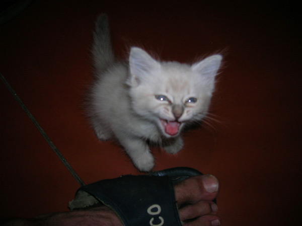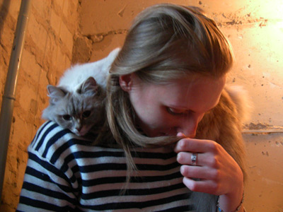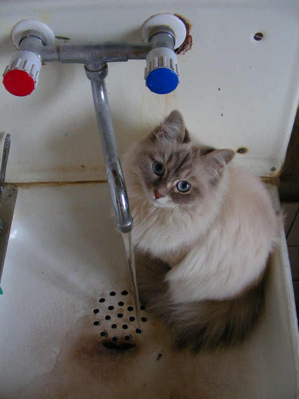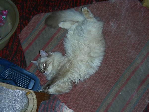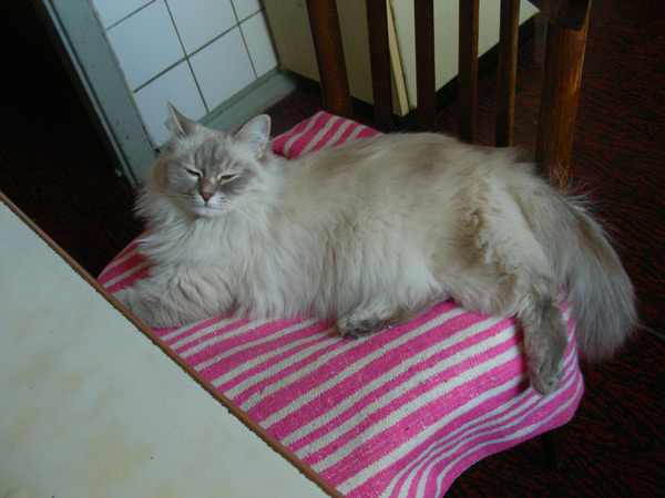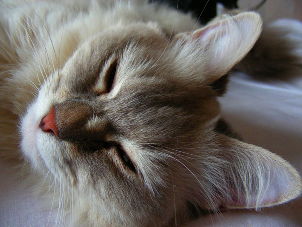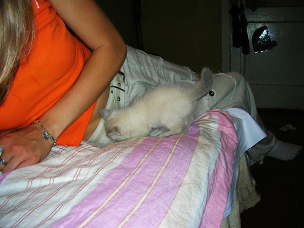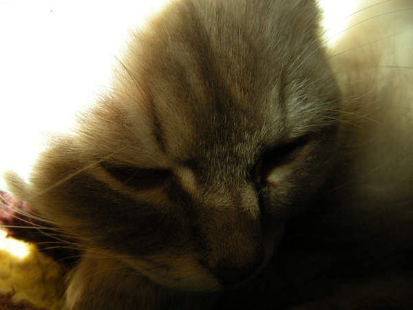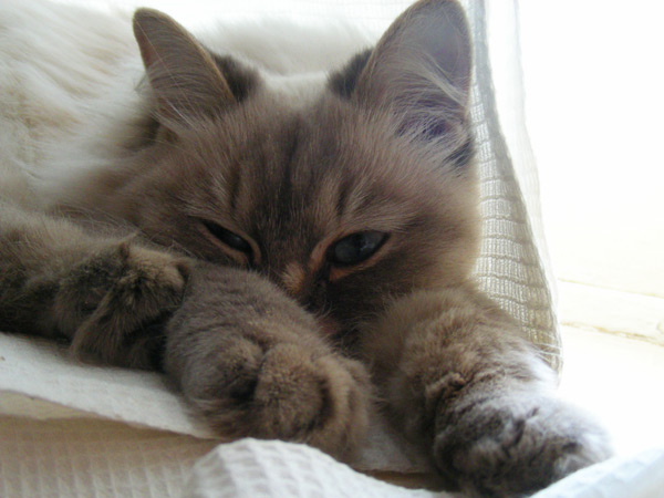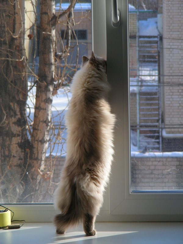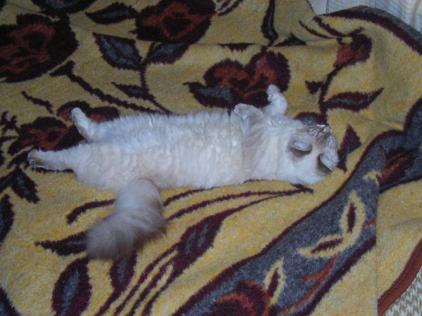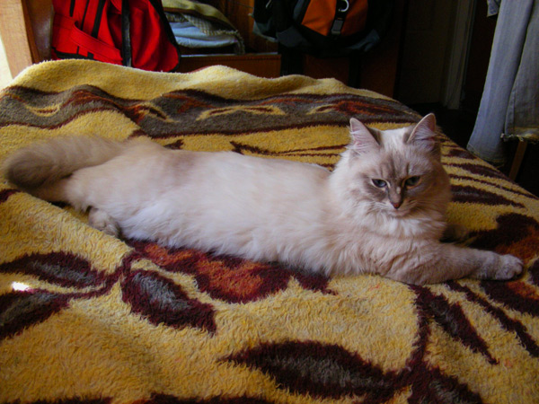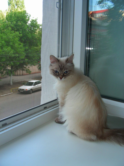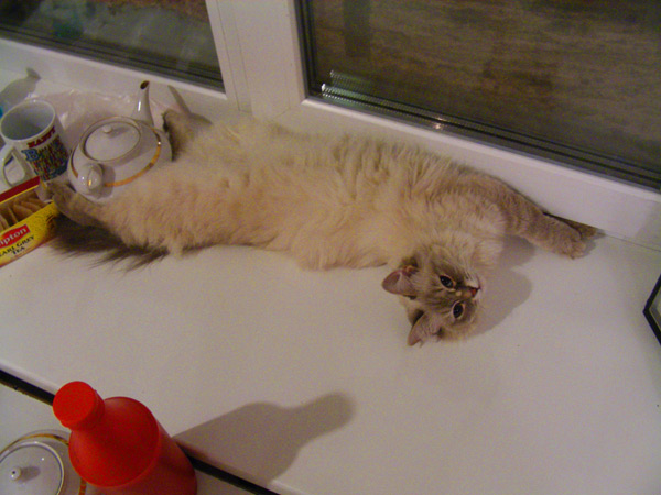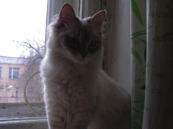 Бася, как классическая сиамо-бирманка, обладала характерным окрасом и шерстью из толстого, не длинного, прилегающего к телу волоса. Я очень надеялся, что котятки сие унаследуют, но папанино наследство обнаружилось довольно быстро в виде густой длинной шерсти с пухом. Сибиряк, наверное, ночующий в норе в сугробе... Признаки сиамского окраса даже на сегодняшний день весьма призрачны...