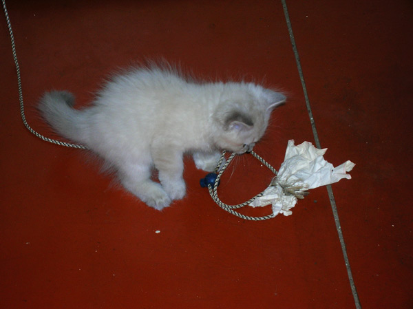 Василий - зверь коробочно-норный. Лучшей игрушкой для неё является брошенный на пол полиэтиленовый пакет. С этим пакетом можно творить много интересных и весёлых штук. В него можно залезть и сидеть в нем руководствуясь принципом "если я их не вижу, то они меня тоже не видят". Можно его на себя надеть, пролезши в ручку и потом носиться с ним по квартире как с прашютом, шугаясь от его же шороха. На худой конец его можно с удовольствием погрызть в области ручек. Многие пакеты в нашей квартире заканчивают своё полезное существование именно таким образом )