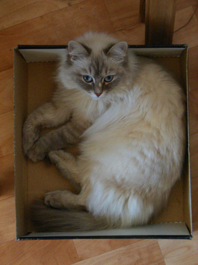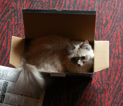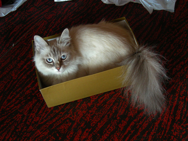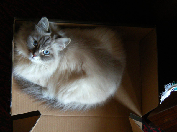 Любая появившаяся в доме коробка, в которую потенциально можно залезть (ну или нельзя, но всё равно можно попытаться), становится объектом пристального внимания, обнюхивания, потрагивания мягкой лапой, переворачивания и проникновения. Особый кайф - сидя в коробке неожиданно выскочить и схватить кого-нибудь за ногу!