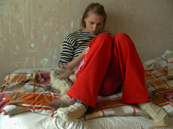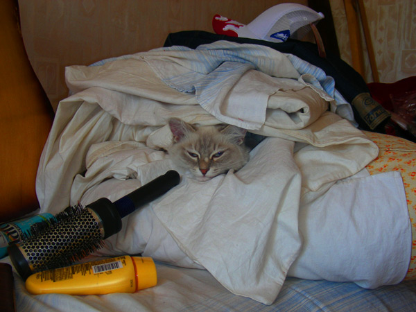 Будучи допущенной спать в постель, не терпит возни и переворачивания - уходит спать на край или в какие-нибудь тёплые одёжки, брошенные на кровати.