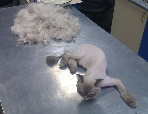 Стригут в клиниках котов под наркозом - в зависимости от габаритов и буйности выбирается и доза. Наша оказалась лузерам по обеим статьям, так что, получила дозу незначительную и могла наблюдать за экзекуцией собственными, хоть и ошалелыми глазами.