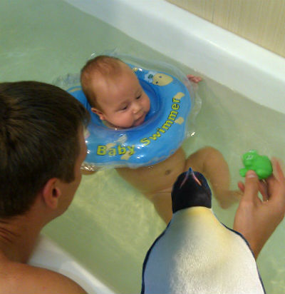 Санька мы начали купать, сначала держа на весу, согнувшись буквой "Г" над ванной. Всяческие шапочки с поплавками, в изобилии переданные нам по наследству от старших товарищей, у нас не прижились (как, собственно, и у них), поэтому водные процедуры были довольно краткосрочны.