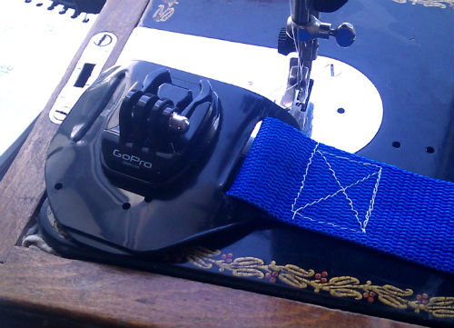 Покупаем подходящую по ширине и цвету стропу и необходимую фурнитуру. Я купил метр синей стропы, полметра черной "липучки" и ременную застежку. Пристрачиваем: