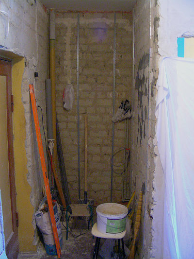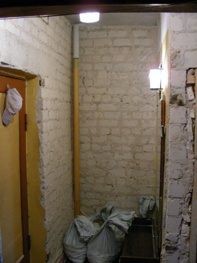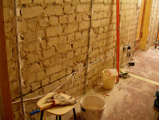 Далее, конечно же, отбивание старой штукатурки. В очередной раз хочется отметить странную особенность: смесь, использовавшаяся для оштукатуривания стен оказалась на порядок более стойкой в сравнении с использовавшейся при возведении перегородок. Перфоратора у меня на тот момент не было и отбивать приходилось зубилом и молотком...