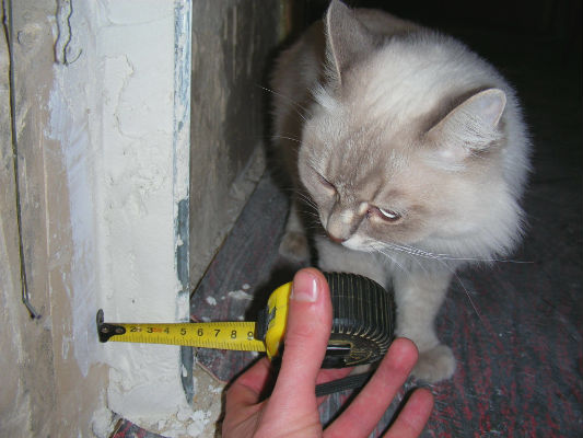 За разрушением начинается созидание. Выставляем маяки под оштукатуривание. На фото Вася в шоке от 5см завала стены.