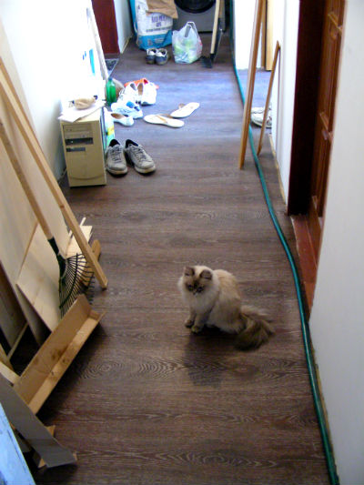 Маяки в нише слева от входа. Тут уже выведены коммуникации под установку нагревательного котла и стиральной машинки. Под машинку была удалена часть деревянного настила пола и сделана стяжка, на которую позже был уложен керамогранит.