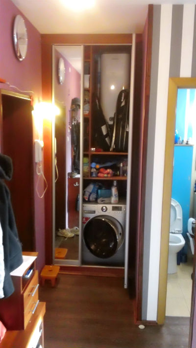 Вокруг стиральной машины и водонагревателя у нас осталось достаточно большое свободное пространство. Думали сначала сделать шкаф-купе, но ширина в 1,1 метра не позволила сделать 2 полноценные сдвижные панели. После некоторых прикидок придумали распашные дверцы разной ширины и множество внутренних полочек. Почти все вещи вместились в шкаф.