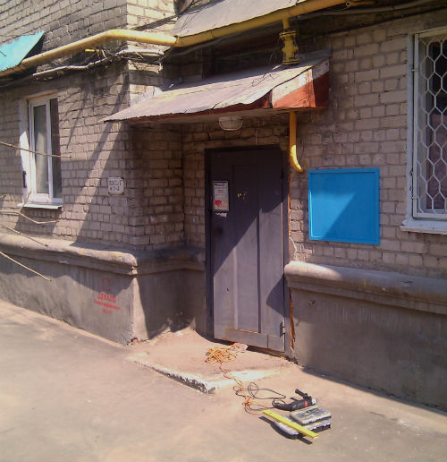 В субботу после утренней тренировки по теннису взялся за электролобзик и отвертку. Из старых запасов краски осталось немного голубой из ванной. За время ожидания она сильно подсохла и пришлось долго разводить ацетоном. Все равно, получилась слишком густая, зато быстро высыхала. За полчаса уже было готово. Вышел, протянул удлиннитель, наметил по уровню и (навесил), как и обещал.