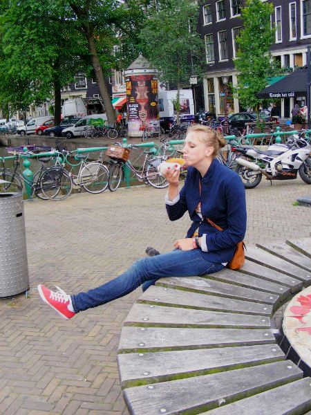 В каждой стране надо пробовать национальную кухню, иначе погружение будет не полным. В Голландии обязательно надо попробовать местную селедку. Ее продают в небольших ларечках на улице и на пляжах и едят либо прямо без всего, либо в булочке с лучком и колечками соленого огурчика. Гуляя по городу мысль о селедочке не покидала Таньку ни на минуту и, как только такой ларечек попал в поле зрения, селедка была тут же куплена и заточена. Очень хороша селедочка!