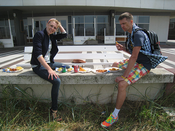 С голодухи удержаться и не накупить кучу всего вкусного весьма не просто, и мы взяли столько, сколько смогли унести в 6 руках. От ларька решили отойти и расположиться на лавочке набережной неподалеку. Дойти до нее и самим съесть добычу оказалось нелегко, т.к. сильные порывы ветра так и норовили унести из рук заветную тарелку с кольцами кальмара в кляре, а полчища чаек, парящих прямо над головой постоянно предпринимали попытки разделить с нами трапезу.