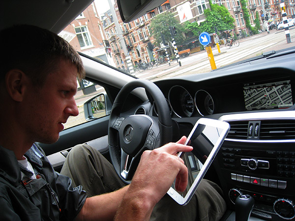 Дальше - веселее. Мы, воодушевленные, проверяем документы, замеченные дефекты автомобиля, получаем ключи и прыгаем внутрь. Внутри - как в болиде Formula 1 - все в кнопках и рычажках. Экран большой на панели, все новенькое, блестит. Ну я - как в автошколе учили - сиденье, зеркала под себя отрегулировал, машинку завел. А дальше надо: 1. задать в навигаторе маршрут до Антверпена; 2. аккуратно сдать из гаража и не въехать в первый же бордюр.