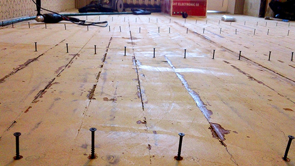 Далее - укрепление и облагораживание пола. Снимаем старый линолеум. Затем по шляпкам гвоздей определяем, где проходят лаги и каждую доску пола притягиваем к каждой лаге 120мм саморезом. Очень утомительно, зато избавились от скрипа.