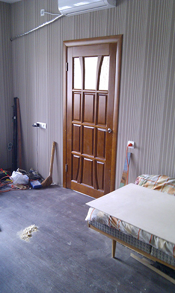 Заказаны и установлены новые дверные коробки и двери из массива (пр-ва Йошкар-Ола). На картинке уже виден кондиционер и установленные розеточки.