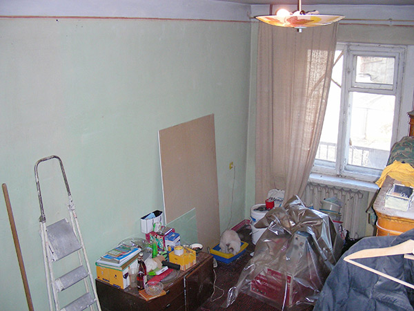 Работы начались с массированного избавления от всего, "нажитого годами". Были сняты и отданы в добрые руки все ковры и тумбочка для белья. К новому хозяину уехал полный тираж Большой Советской Энциклопедии. Большинство книг были переданы в библиотеку.