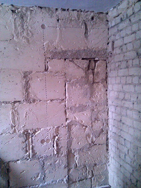 Из разряда интересных находок была обнаружена еще одна старая дверь. Вход в кладовку раньше был здесь. На фото так же видно, как делались штробы под проводку. Прорезать их болгаркой - занятие крайне пыльное, а так - хоть и дольше, зато чище.