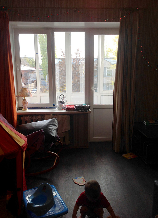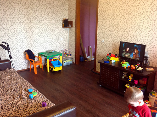 Комната была густо завешана коврами поверх зеленых побеленых стен. Беленый потолок раскрошился на стыках плит перекрытия. Тонкое 2мм стекло в высохших деревянных рамах кое-где треснуло и было заклеено клейкой лентой. На всю комнату приходилось 3 розетки. Освещалась гостиная люстрой, в которой горела только половина ламп, т.к. часть проводки была где-то нарушена. Поверх дощатого пола полосами был поклеен красный линолеум.
