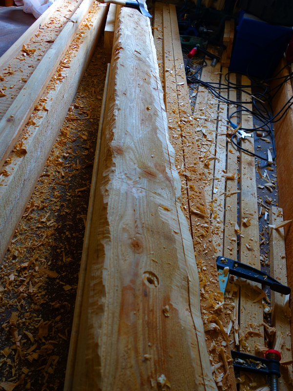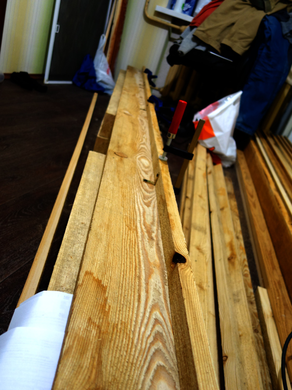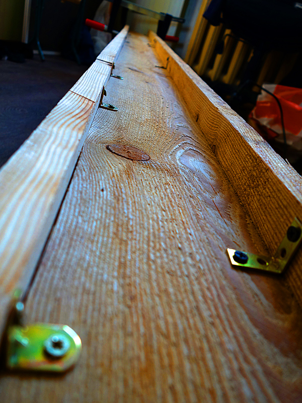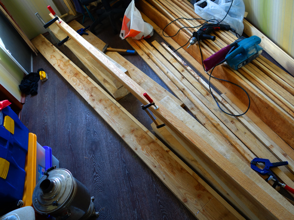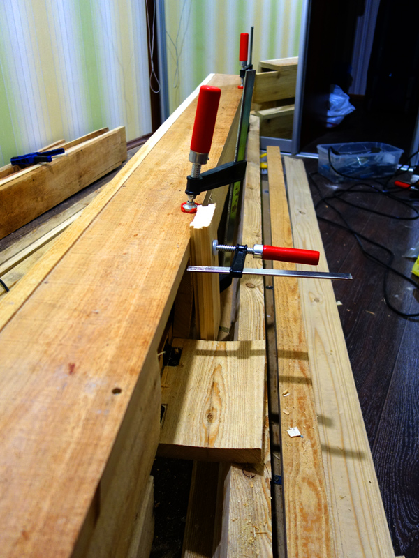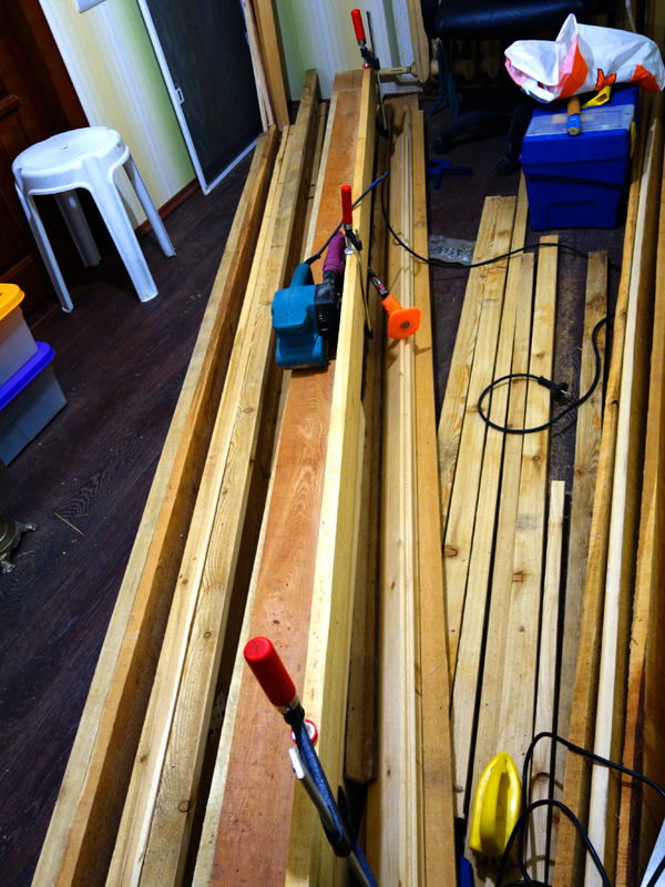 На этапе сборки мне понадобились шлифмашина ленточная, рубанки (электрический и ручной), электролобзик, струбцины разных размеров (много), клей, уголки металлические и саморезы.