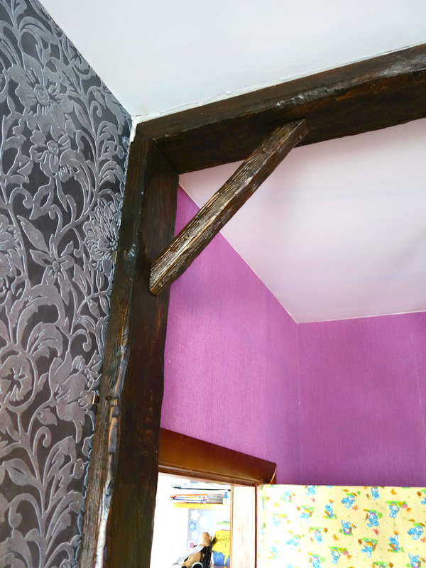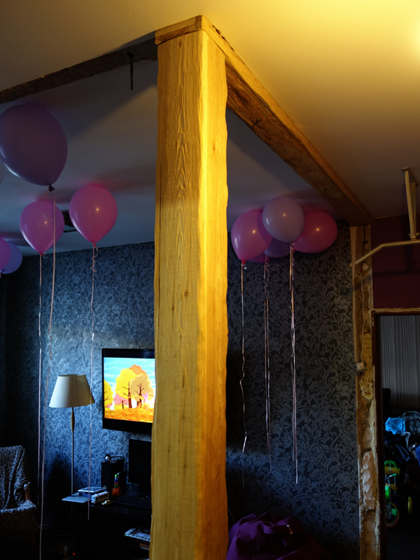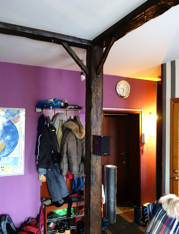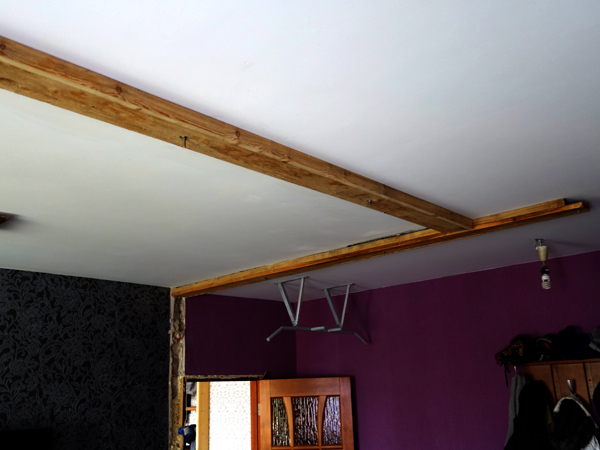 Вот тут видно, что 4-метровую балку пришлось распилить, чтобы пронести в дом. Но в итоге стыка совсем не видно.