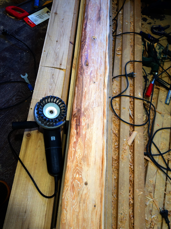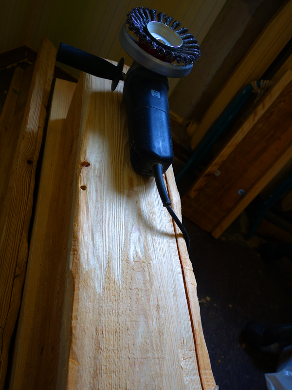После этого поверхность тщательно обрабатывается корд-щеткой. Причем, такая конфигурация щётки (стаканом), на мой взгляд, несколько более удобна по сравнению с плоской. В процессе работы щеткой выбираются более мягкие участки древесины, делая поверхность более структурной и при этом - гладкой.