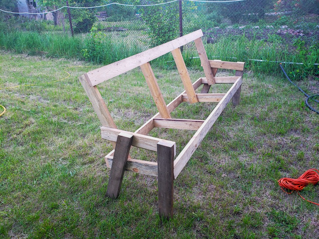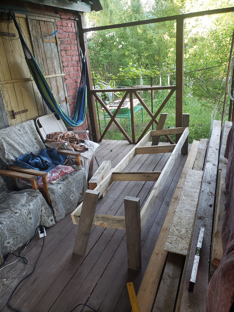 Ещё в прошлые дачные вахты я соорудил для посиделок на веранде обеденный стол, вокруг которого все рассаживались на старых табуретках и паре потертых кресел. Было не всегда всем удобно, но как-то размещались вобщем. Тогда и появилась у меня мысль сделать на веранду простую, но вместительную скамейку, чтобы избавиться от проблем с массовой рассадкой.