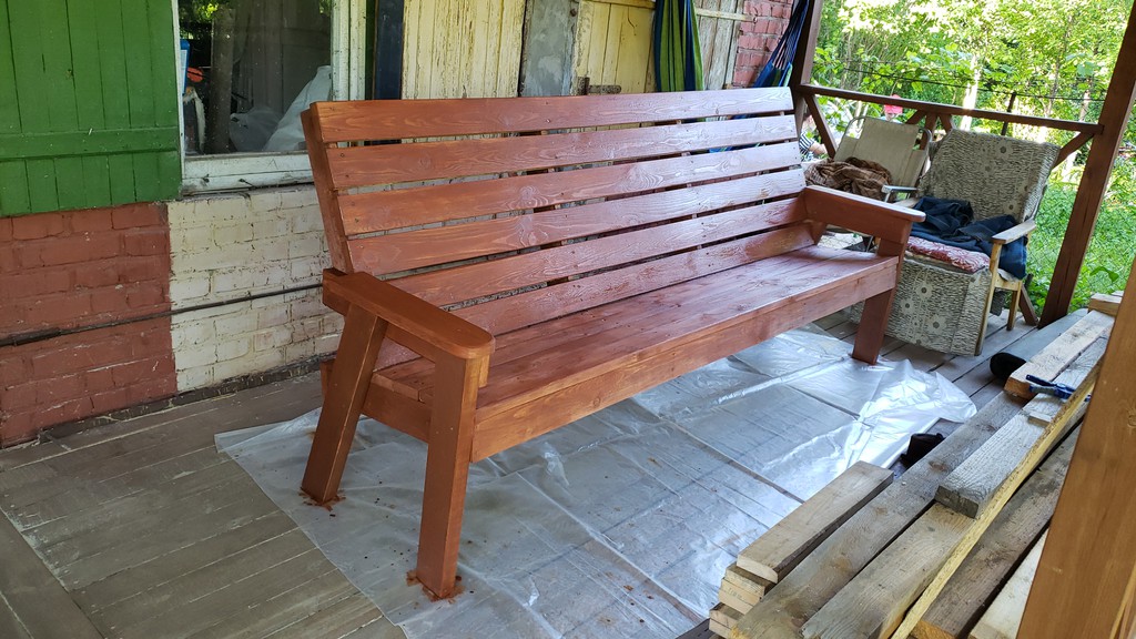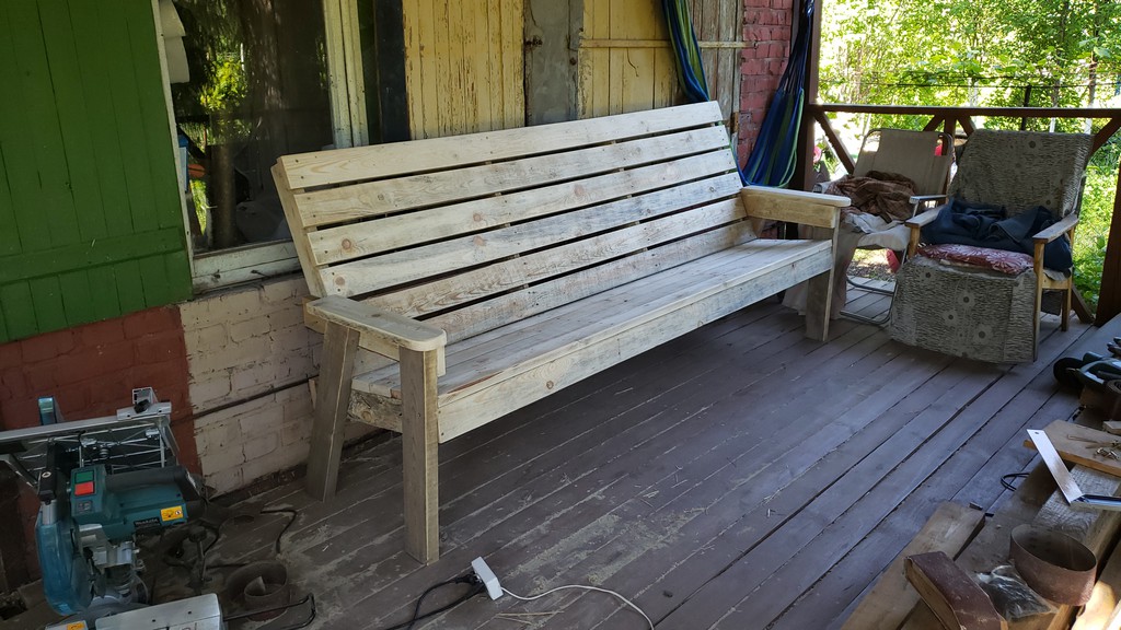 Высота и углы спинки и сиденья вымерял по себе, так что для моей многострадальной спины получилось весьма комфортно. На лавке комфортно размещается 4-5 взрослых людей. Общая ширина порядка 2500 мм.
