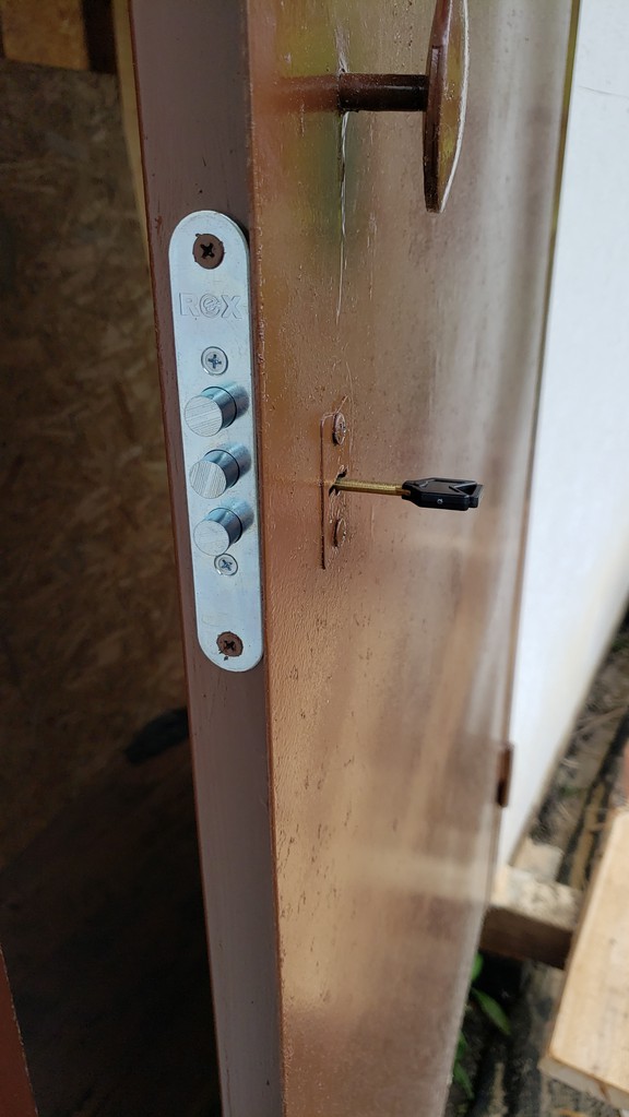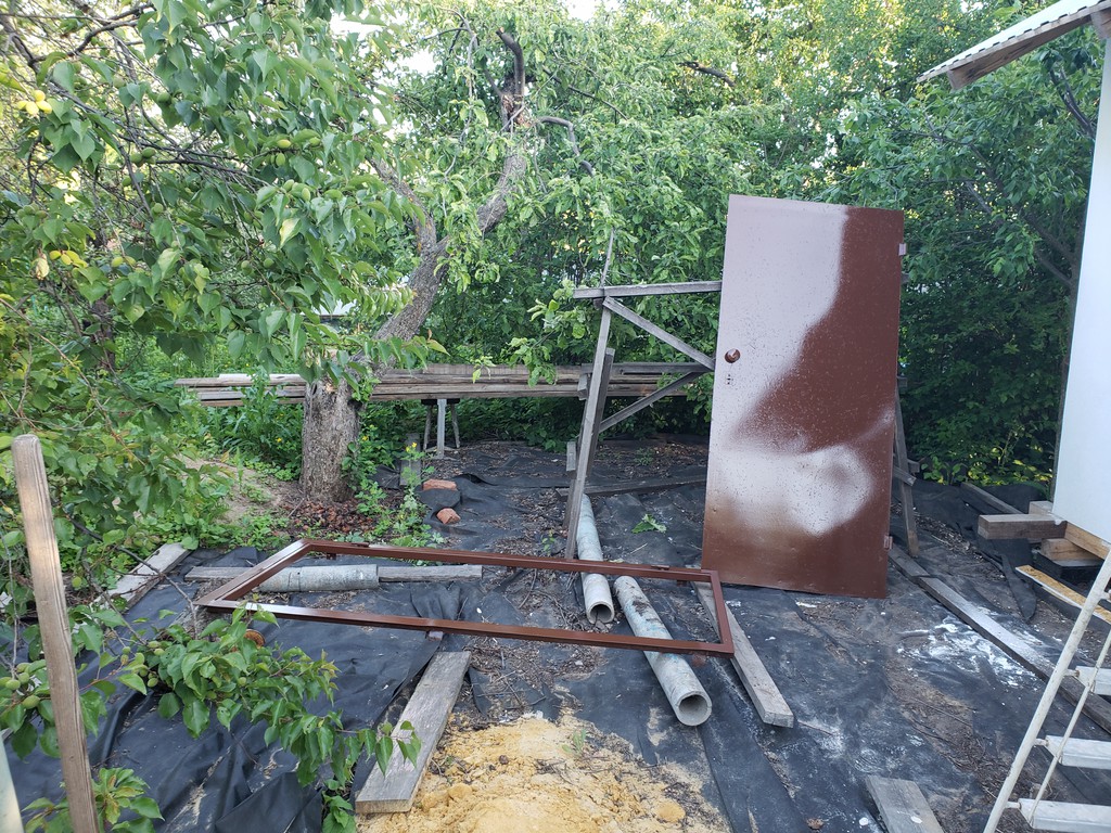 В строении два в хода: в туалет и хозблок+душ. Если в туалет сойдет любая дверь, то для хозблока потребуется что-то посерьёзнее, т.к. там будет храниться ценная газонокосилка и другой инструмент, с которым не хотелось бы расставаться в ближайшее время. По большой удаче у друга в гараже оказалась ненужная стальная дверь от квартиры в новостройке и он мало того, что безвозмездно мне её отдал, так еще и довез на своей машине до дачи и помог выгрузить!