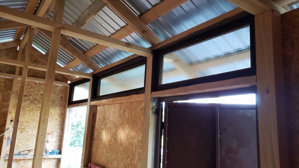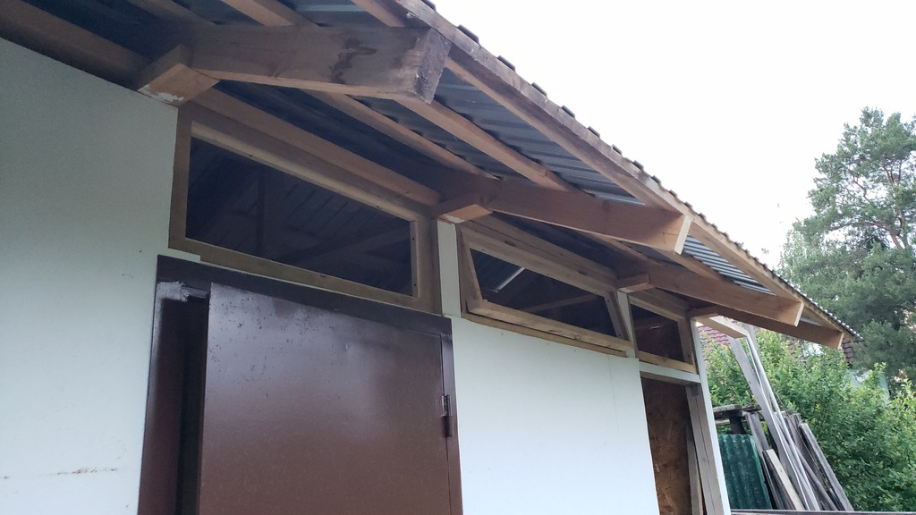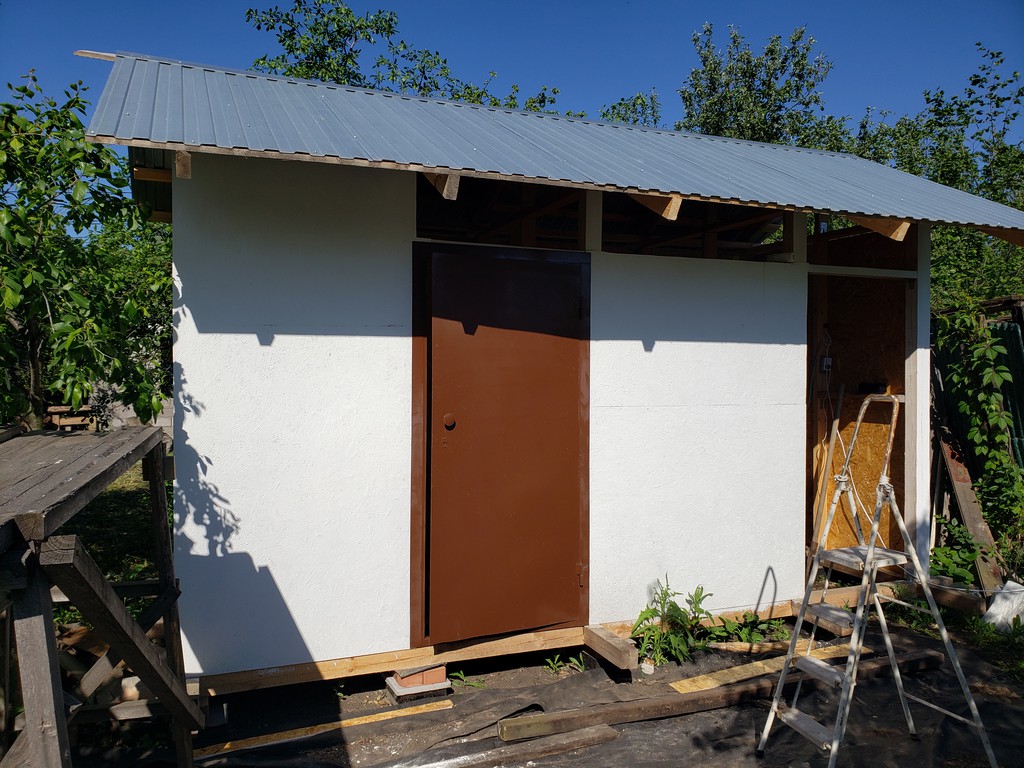 Повествование о нём, вероятно, следовало начать с самого начала (задумка, закладка столбчатого фундамента года 3 назад, нижней обвязки, возведения стен и крыши в прошлом году), но руки не дошли. Таким образом мы имеем отдельностоящее сооружение размером где-то 2 на 5 метров, обшитого ОСБ и двухскатной крышей, покрытой профлистом.