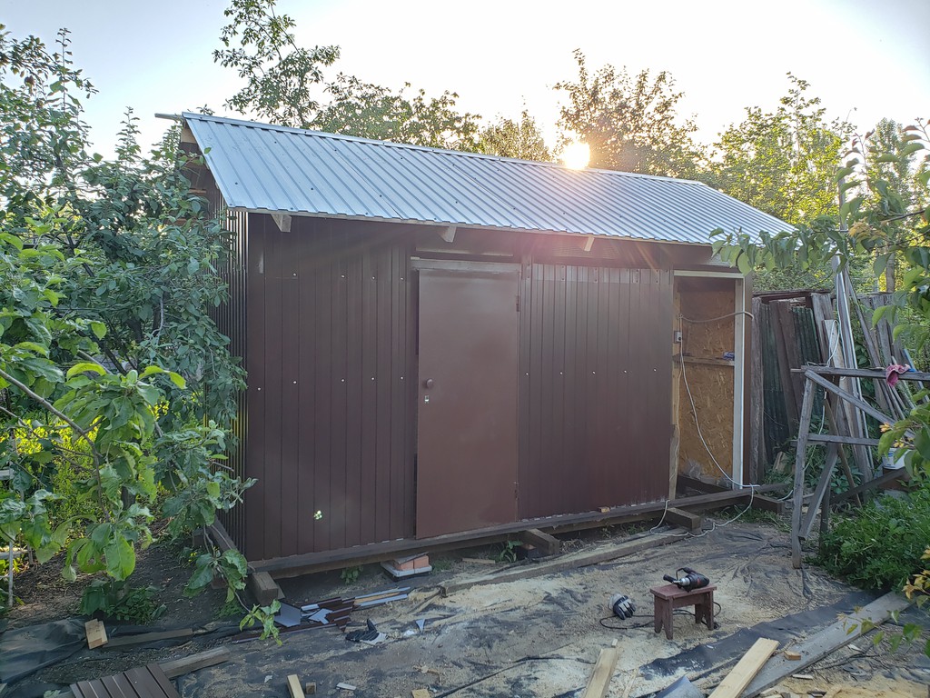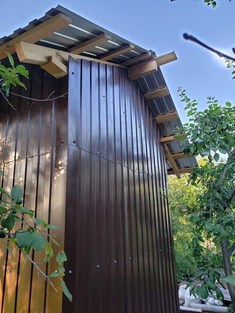 Ну, в этом разделе интересного мало: оставлять строение со стенами только из ОСБ - непрактично. Материал впитывает влагу, да и в принципе довольно легко разрушается от внешнего воздействия. Сначала думал обшить вагонкой (что сейчас уже кажется не самой плохой идеей), но в результате остановился на профлисте.