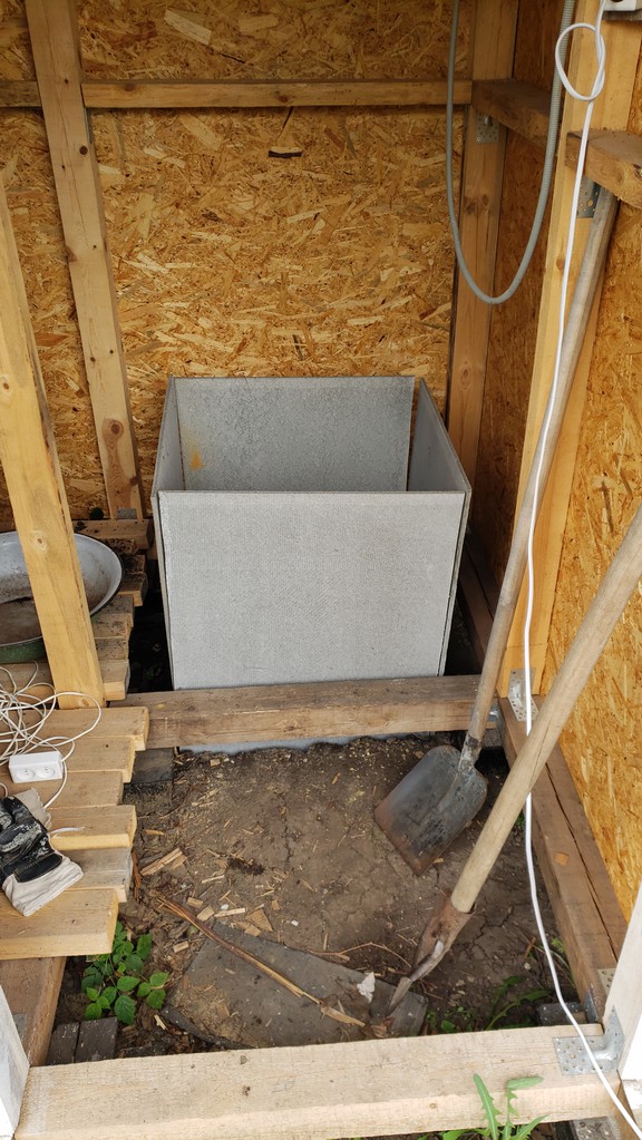 Чисто для отчёта, в туалете выкопал выгребную яму и соорудил в нее резервуар из листов толстого шифера.