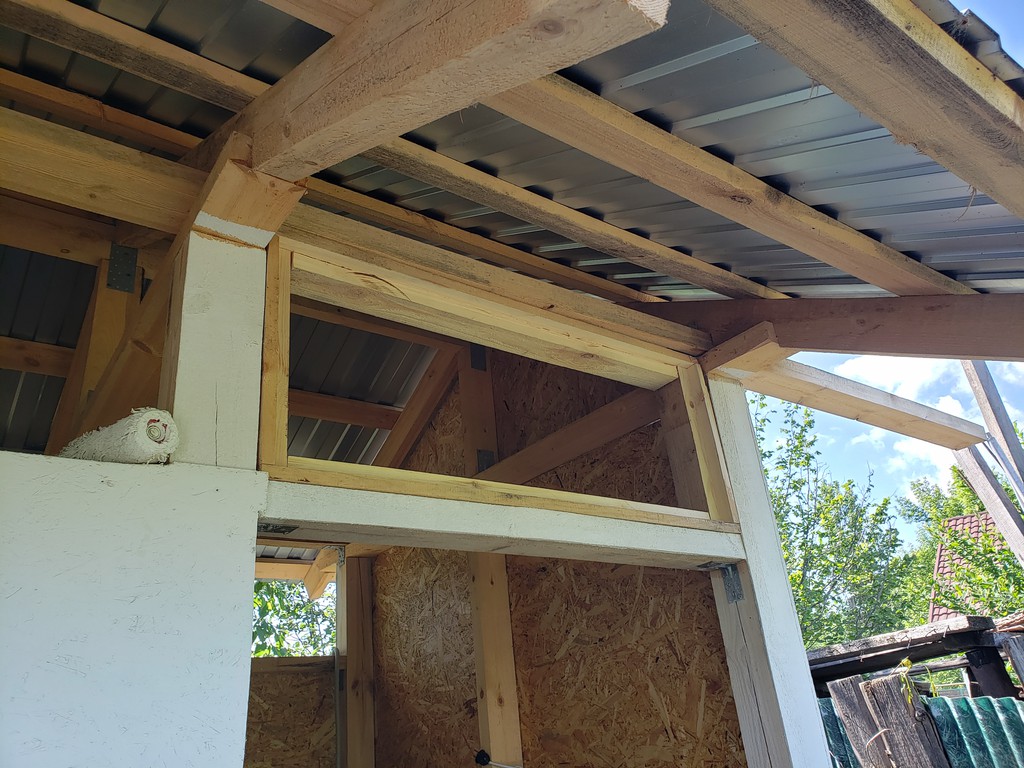 Ну а самым вкусным, конечно же, оказалось закрывать боковины со сводами крыши )) Тут и коньковый брус торчит, и балки верхней обвязки выступают, и весит это все безобразие довольно много (с учётом того, что держать нужно одной рукой на весу, а второй - крепить саморезами).
