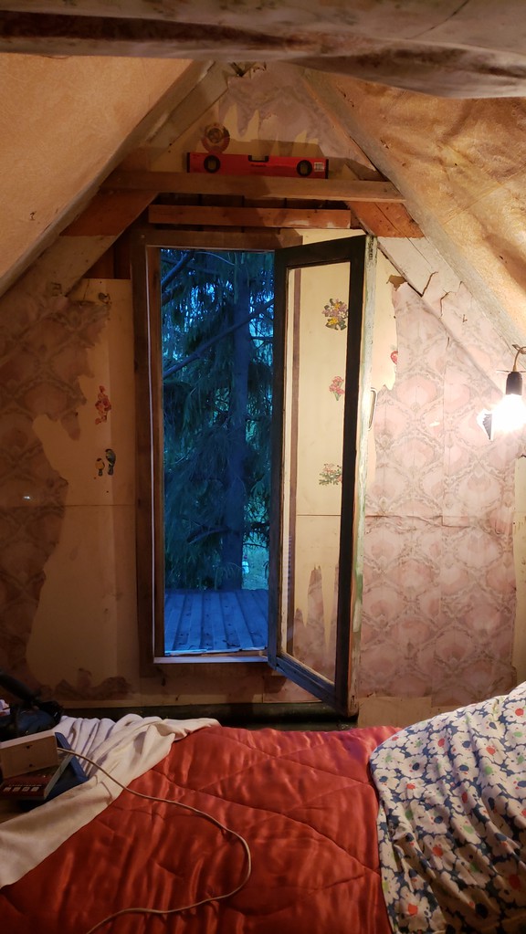 Voila! Поскольку появилась рама, отверстие в стене тоже пришлось расширять и таким образом у нас попутно появился выход на крышу веранды, куда раньше приходилось лазать по лестнице!