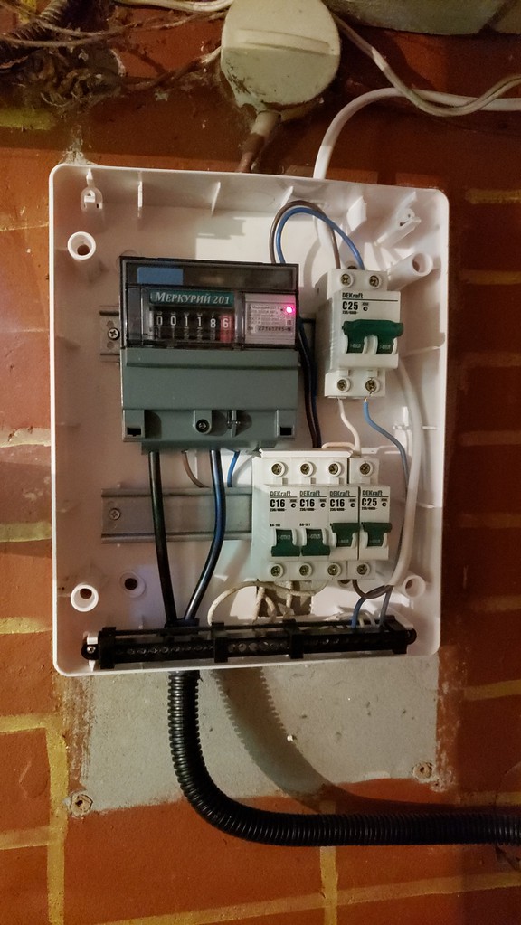 Пару лет назад всех дачников обязали обновить проводку от столба до щитков в дачах и установить счетчики. Я нанял электрика, который слазил на столб, завёл в дом толстый кабель и смонтировал щиток с несколькими автоматами и счетчиком. Уже позже, когда местный электрик пришел счетчик опломбировать и открыл монтажный бокс, после пристального вглядывания он повернулся ко мне и сказал: "Это я пломбировать не буду". Ребята подошли с фантазией и сделали всё не совсем так, как положено. Удачный момент, чтобы все переделать как надо и провести проводку в хозблок без необходимости переделывать после.