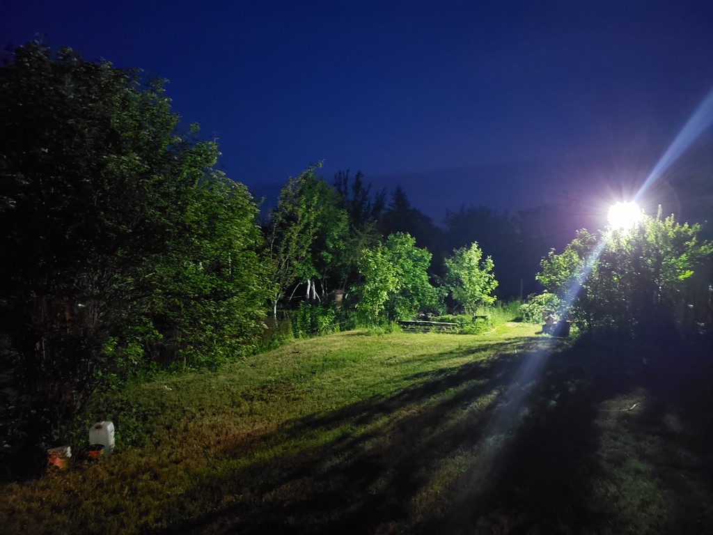 Ну а первым электропотребителем на стройке стал небольшой LED-прожектор, установленный на мачту для ночного освещения участка. Светло как днём!